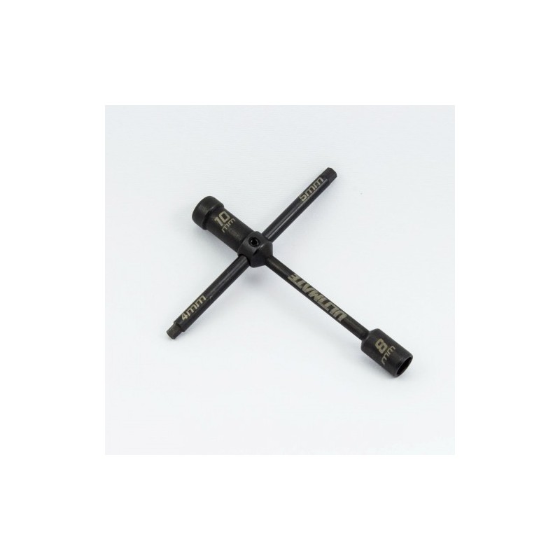 Llave Pro-T de Ultimate Racing. Esta llave es una de las mas versátiles y unica para las carreras nitro, y está destinada a ser una de las herramientas más valiosas de tu caja de herramientas. Forma parte de la gama de herramientas de Ultimate Racing, esta herramienta combina 4 llaves: una llave de tubo de 10mm para las tuercas de embrague, una llave de tubo de 8mm para bujías, una llave allen para tuercas de 5mm. Su diseño es ligero y ergonómico para una utilización cómoda y de máxima adherencia. Lleva grabado el logo de Ultimate Racing.